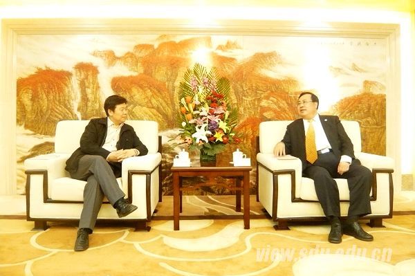 山东大学校长徐显明(左)与山东能源集团董事长卜昌森(右)交流推动校企合作