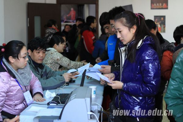 2012年,山东大学艺术类招生工作首次实行一体化招生,学校艺术类各专业按照一个代码(10422)招生,在济南、威海有关校区培养。为了做好艺术类一体化招生工作,学校教务处、招生办公室、艺术学院与威海校区有关部门和学院进行了深入沟通和精心筹备,对测试内容、测试方式、报考条件等进行了调整和修改,并确定了音乐学(济南)、音乐学(威海)、舞蹈编导(威海)、美术学(济南)、美术学(威海)、工业设计(济南)、艺术设计(威海)等招生专业,在济南、成都、太原、长沙、杭州等五个考点共同招生、共同组织测试,迈出了一体化招生的第一步。9、10日美术类专业济南考点的报名工作也同步进行,9日报名人数已近千人,12日进行测试。另外,成都考点已于春节前完成测试工作,杭州考点报名考试工作正在进行中,太原、长沙考点将于近日开始报名和测试工作。