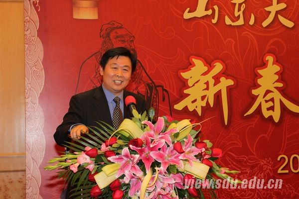 徐显明在讲话中代表学校对出席活动的北京校友表示热烈欢迎和衷心感谢,向获得110周年校庆突出贡献奖的校友和2011年度十大杰出校友称号的校友表示祝贺。他向校友们通报了学校110周年校庆工作的情况,高度肯定了广大校友对校庆取得圆满成功的大力支持和积极参与。他说,“文化校庆、学术校庆”是山大在繁荣和发展中国文化上的高度自觉,通过校庆各项活动的举行彰显了文化的魅力、学术的魅力、山大的魅力和建设世界一流大学目标的魅力。他还向校友们进一步诠释了学校在新时期提出的建设世界一流大学的办学目标,介绍了山大在2011年取得的各方面的成就:签署省部共建山东大学的第三期协议,获得政府的更大力度的支持;制定规划山大未来十年发展的“攀越计划”;青岛校区建设和构建“山东大学系统”的实践迈出了实质性的一步,山东大学的各项事业均达到了前所未有的高度;师资力量加强,在传统文化研究方面都取得了良好的进展;学校的国际影响力大幅度提升,综合办学实力和竞争力明显增强,办学质量和为国家、区域服务的能力显著提高。最后他向广大校友拜年,祝愿广大校友在新的一年工作更加顺利,生活幸福,身体健康。
