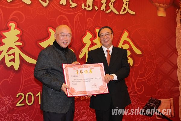 [本站讯]1月15日,山东大学北京校友2012新春招待会在北京举行。校党委书记李守信为获得“山东大学110周年校庆突出贡献奖”的项怀诚等在京校友代表颁发证书。校长徐显明为“山东大学十大杰出校友”颁发证书。校党委副书记李建军、方宏建,副校长张永兵等出席会议。副校长樊丽明主持招待会。