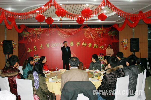 [本站讯]正是今年风景美,千红万紫报春光。1月21日(农历腊月二十八)晚,山东大学中心校区餐厅三楼流光溢彩,处处氤氲着新春的喜庆与热闹。山东大学200多名留校学生在此相聚,共享学校的关爱和祝福。山东大学校长徐显明,校党委副书记方宏建,副校长张永兵、陈炎等与学生们一起除旧迎新,互致美好祝愿。