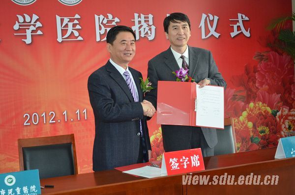 [本站讯]1月11日,山东大学教学医院签约暨揭牌仪式在济南市儿童医院举行。山东大学副校长陈炎,济南市卫生局党委书记、局长贾堂宏出席揭牌仪式并讲话。