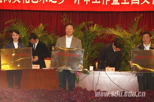 山东大学艺术学院院长李晓峰等一同参加了相关活动。为发挥山东大学作为全国重点高校在学科建设和科研能力方面的优势,更好地参与国家文化建设,实现传承文化、服务社会的社会职能,根据文化部的工作部署,山东大学积极组织开展全国基层文化队伍培训基地的申报工作,并由艺术学院具体负责实施。艺术学院根据文化部相关文件规定,对培训基地的硬件设置、师资队伍、课程设置、培训程序等内容进行了全面、细致的规划,凭借雄厚的教学和科研实力,充足的培训场所,一流的教学设施,严谨扎实的准备工作,在材料审核、申报答辩、专家考察等环节均获得了评审专家的一致好评,最终被确定为首批全国基层文化队伍培训基地。以此为契机,山东大学将进一步加强与文化部、山东省文化厅及各级文化主管部门的合作,扎实、细致、高效地参与到国家公共文化服务体系建设实践活动中。