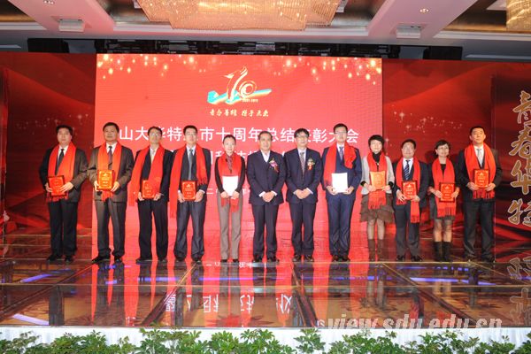 山东大学党委常务副书记尹薇(左六)、山东省环境保护厅厅长张波(右六)为获得爱岗敬业模范称号的人员颁奖