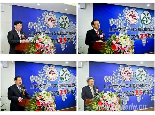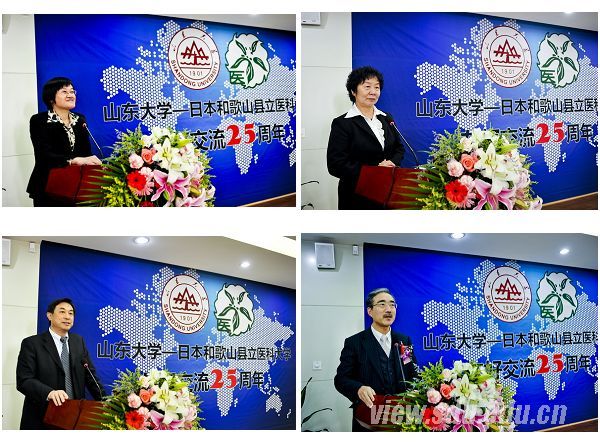 山东大学副校长张运(左上)、板仓彻(右上)、原山东大学副校长李承俊(左下)、和歌山县立医科大学医学部部长岸岡史郎(右下)在庆祝仪式上致辞