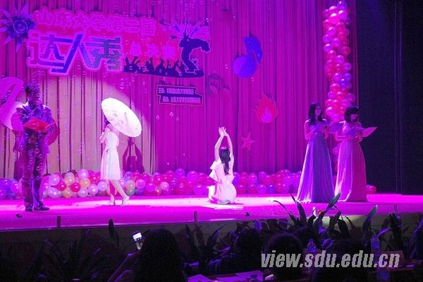 比赛晚会由山东电视台节目主持人、山大校友蒋佳琦主持。晚会节目异彩纷呈,现场观众掌声如潮。奇幻魔术与灵炫动作完美结合的开场舞点亮了全场激情;扇子舞《茉莉花开》在悠扬的音乐中缓缓展开,时而舒缓柔媚,时而灵动奔放,曼妙的舞姿仿佛将人们带到春天茉莉花的故乡;男生集体舞蹈《万佛朝东》赋予了新的社团文化内涵,令人在似曾相识之余更觉耳目一新;几位选手的原创歌曲富含文化内涵和心灵絮语,不觉令人惊叹山大学子的艺术才华和创作激情;街舞表演韵动全场,飞扬的舞姿带来冲击极限的快感,让人们感受到青春的激情与活力;跆拳道表演者一改学生的温文尔雅,身着白衣,凌厉刚毅,吸引了众多女生的目光;快板表演活跃了全场气氛,让人于诙谐戏谑中体验民族文化的强大张力;民族舞串烧用华美的民族服饰、极具边疆特色的绚丽舞姿为观众奉献了一场民族文化盛宴……与此同时,蒋佳琦智慧幽默的解说为整场晚会增色颇多。为了更好地与观众交流互动,达人秀晚会现场再次引入了微博互动,大屏幕上不断跳动的语言显示出观众极大的参与热情。晚会中还安排了三次抽奖环节,观众的热情被一次又一次引爆。来自山东电视台、山东艺术学院、山东省音乐家协会的5名艺术编导和艺术老师观看了晚会并担任评委。