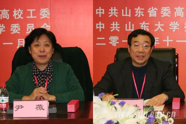 山东大学党委常务副书记尹薇(左)、中共山东省委高校工委副书记齐秀生(右)出席会议