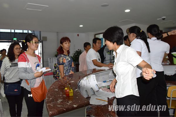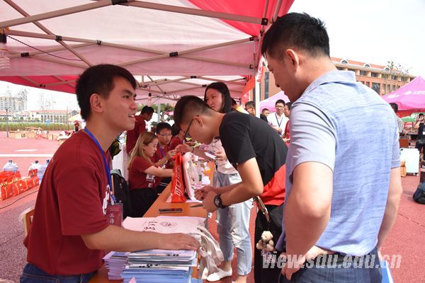 走进红色的迎新拱门,现场一派热闹有序的场景。六个迎新学院在广场上由北向南一字排开,每个学院前都有详细的学院介绍、优秀学子风采、特色活动等展板展示,辅导员们一遍遍对前来报到的新生家长们说着:“请家长们到旁边休息区休息,让孩子们自己来,这是他们的大学第一课。”;迎新吉祥物们向新生俏皮地卖萌;无人机和3D打印机展示现场,一群新生在围观,上空还盘旋着正在展示的无人机;校园广播中播放着与新生报到相关的注意事项以及青岛校区情况介绍;照片墙、签名墙、家长卡片寄语……各学院都用自己独特而温馨的方式迎接着他们在青岛校区的第一届新生;身着“山大红”T恤的志愿者们在现场穿梭忙碌着……忽略掉身后极具特色的建筑群和校园环境,记者仿佛置身于山大在济南各校区最热闹的迎新现场,如果非要说有什么不同的话,那就是:更热情周到的服务和更灿烂的微笑。