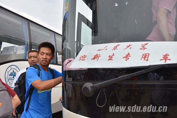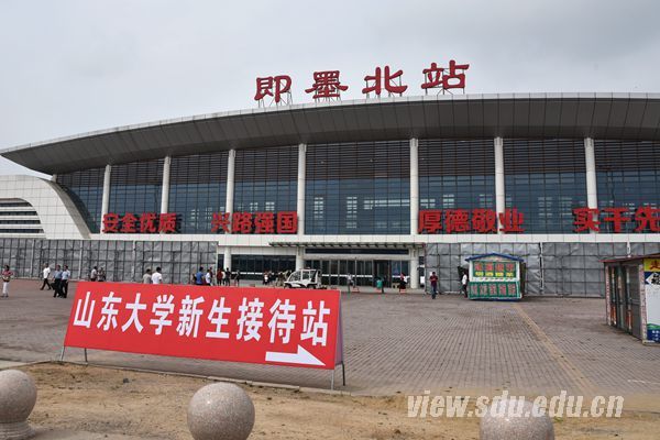 从即墨北站下了火车,刚走出出站口,对面两位举着“山东大学迎新接站”的志愿者就撞入我们的眼帘,大红的T恤,“山东大学欢迎你”的字眼印在上面,鲜艳而又温暖。和志愿者刚接到的新生分别坐上两辆迎新大巴,作为青岛校区的第一届新生和迎新现场的报道者,我们与所有的新生一样激动与期待,“青岛校区,我们来了”。