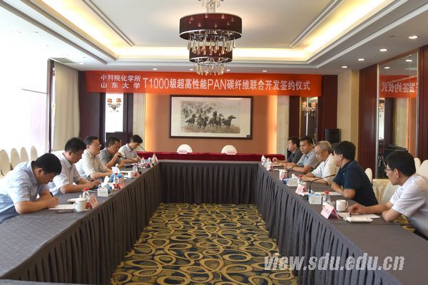 中科院化学所副所长徐坚、山东大学技术转移中心主任李勇分别代表双方签订联合开发协议。山东大学碳纤维工程技术研究中心主任王成国教授主持签约仪式。中科院化学所相关人员,山东大学党委、校长办公室有关负责人,山东大学碳纤维工程技术研究中心相关人员参加了签约仪式。