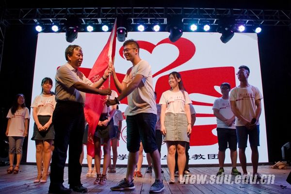 歌会上,仝兴华为第十八届研究生支教团授旗,并鼓励他们将不变的责任与爱心传递下去。支教团倾情演绎小品《把“山岩”唱给你听》,欢乐中彰显着支教团队成员的无私奉献精神和强烈的社会责任感。