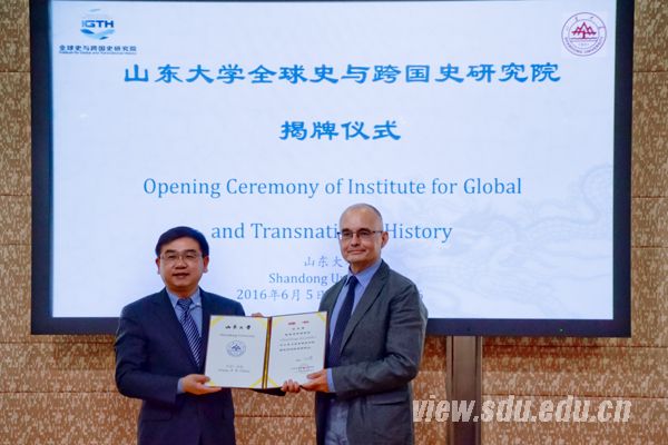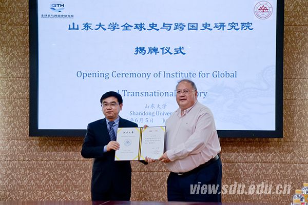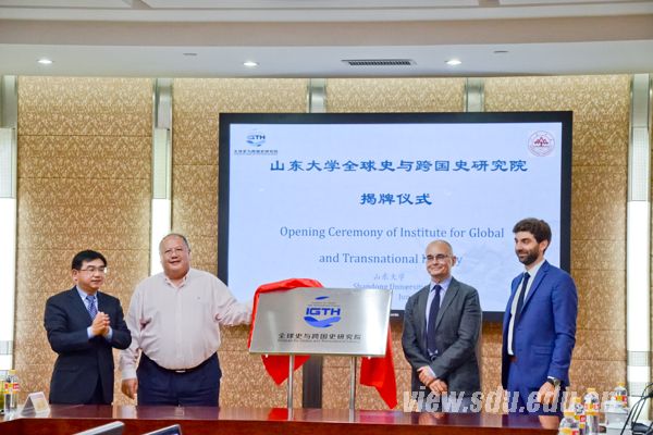 山东大学历史文化学院院长方辉主持揭牌仪式并宣读了山东大学《关于成立山东大学全球史与跨国史研究院的通知》。胡金焱、格鲁津斯基、李中清、顾博为研究院揭牌,胡金焱代表山东大学向格鲁津斯基颁发研究院名誉院长聘书,向李中清颁发院长和兼职教授聘书。