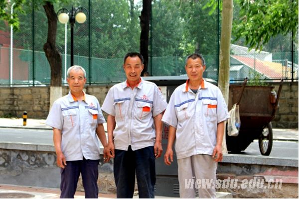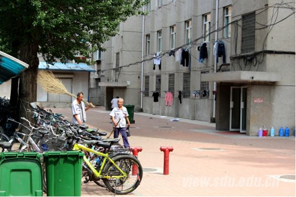趵突泉校区内,王宗兴、蒋胜国、张宝金三人正在六号公寓楼前打扫。老人家没有什么大的梦想,只要校区能干干净净的,这里的人能有一个好的生活环境就好。这并不简单是因为他们把趵突泉校区当做自己的家,而是因为,这里本来就是他们的家。