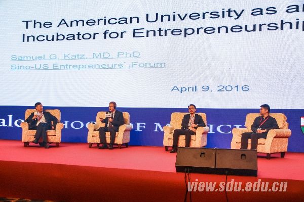 在“创新创业环境的生态要素”论坛上,胡金焱和美国乔治城大学副校长助理Shuigen Xiao作为嘉宾,讨论了对创新生态体系的理解以及怎样培养创新人才等问题。胡金焱认为,从高校角度理解,创新创业的要素可以分为“软”“硬”两方面,“软”即高校理念,“硬”指搭建平台,山东大学搭建“三个功能区、五大支撑体系”培育创新创业人才。Shuigen Xiao认为合作能使中美两国更好地发挥自己的长处,高校应该通过鼓励创新创业来发现人才。