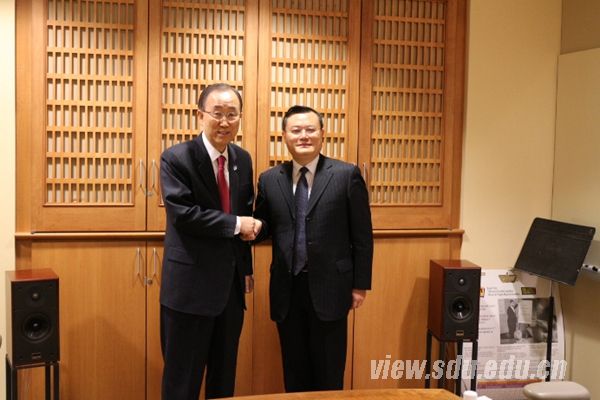 [本站讯]4月12日下午,山东大学校长张荣在美国耶鲁大学与共同参加联合国文化遗产保护全球大学校长会议的联合国秘书长潘基文会见。