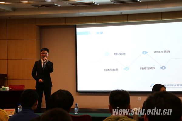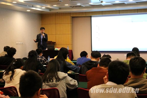 培训会中,吴琦就中美创新创业大赛答辩的相关事宜进行针对性辅导。他以“从知识到商业价值”为题,从“产业化面临的困境”、“商业计划书”、“高科技的孵化”三个方面为大家讲述了他对创业的理解和认识。他给山东大学创业学子提出了四个方面的建议:跳出框框,发展创新思维;要将EQ和IQ的发展并重;要珍惜创业这个极好的训练机会;要成为T-shaped students,平衡发展,学习多专业知识。