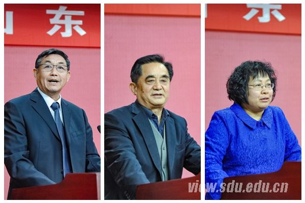 威海校区党委宣传统战部部长刘明(左),民建山大主委、省政府参事、儒学高等研究院马来平教授(中),省政协委员、经济学院侯风云教授(右)作大会发言