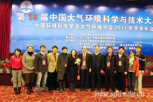 本届学术会议由中国环境科学学会大气分会主办,浙江大学、中国环境科学研究院联合承办。会上,王文兴院士作了题为“大气环境问题及对策”的大会报告。山东大学环境研究院教师李卫军、孙孝敏分别作了题为“区域灰霾大气中农业生物质燃烧来源气溶胶单颗粒的识别及其老化现象”、“大气中萜烯臭氧化机理的理论研究”的分会报告;博士生王哲、周杨作了题为“泰山云雾对碳质气溶胶影响及二次有机气溶胶的生产”、“华北地区高山站点气溶胶酸度研究”的报告。报告得到了参会者的积极响应,其中李卫军和周杨的论文被评为本届优秀会议论文。