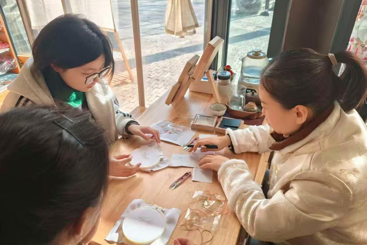 冬日的玉萱阁内,暖意融融,丝线的温润驱散了室外的寒凉,鲁绣传承人戎玉蕊老师正静静地坐在那里绣制着一幅山水。鲁绣传承人程淑芹老师将一幅“柿柿如意” 绣品递到我们手中。指尖抚过绣布,枝干遒劲的纹理、柿果饱满的弧度、叶片灵动的脉络,在光影下透着鲁绣独有的温润质感与立体肌理,那是时光沉淀的厚重,也是匠人匠心的温度。“鲁绣得亲手做,才能懂它的脾气。” 程老师笑着将针线塞进我们掌心,每人面前都摆上了一方素色绣布,布面上早已细致勾勒出柿子图样,枝干走向、果实形态、叶片脉络一目了然,为我们这些初学者铺好了通往非遗世界的“底稿”。“今天咱们就练三种基础技法,亲手感受鲁绣的门道。” 话音刚落,阁内便只剩下绣线穿过绷布的细微声响,一场指尖与文脉的对话,悄然开启。