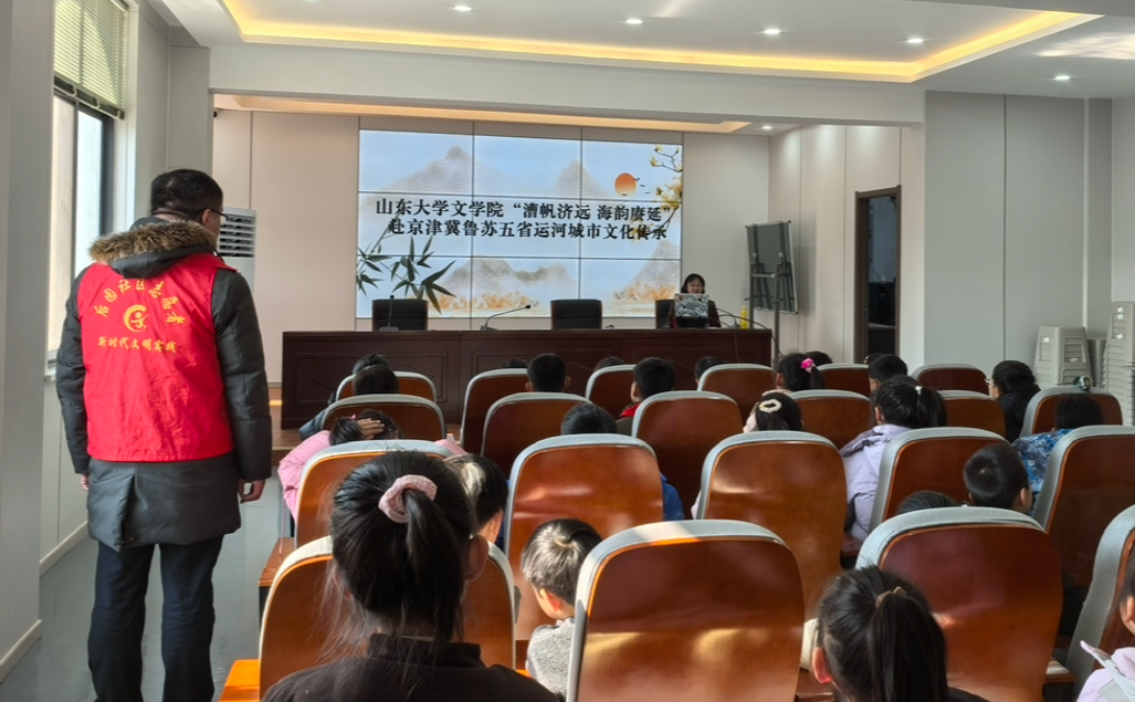 今日,江苏徐州睢宁后园社区暖意融融,我们山东大学文学院“漕帆济远・海韵赓延”运河城市文化传承宣讲团的成员们,带着准备的讲稿、短片和实验道具,早早来到了社区活动场地。40余名1至6年级的小学生围坐成圈,眼睛里满是期待,也让我们对这场运河文化宣讲多了几分笃定与热忱。