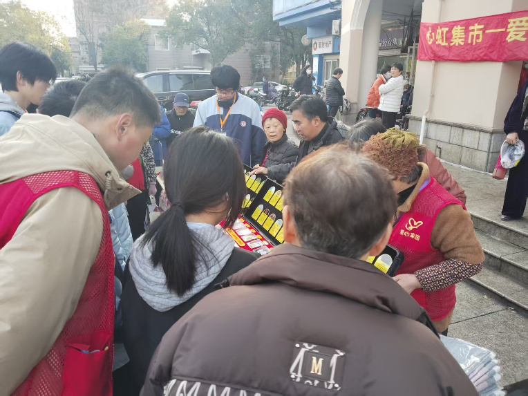 清晨八点,江虹小区广场上早已热闹起来,二十多个摊位环绕广场整齐铺开,将新春的喜庆氛围拉得满满。作为一个扎根社区十余年的自治项目,心虹集市从2012年诞生之初,便承载着服务老年居民、帮扶困难群体、凝聚邻里温情的初心,如今已是松江区乃至上海市都小有名气的志愿服务品牌。抵达现场简单对接工作后,我们便迅速投入到紧张有序的志愿服务中。