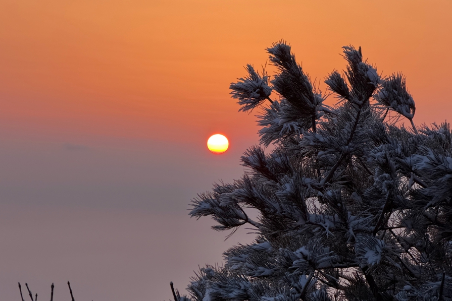 六点四十分,东方的云层忽然裂开一道缝。起初只是一条细细的橙红色的线,像是谁在天边画了一笔,那条线越来越亮,颜色从橙红变成金黄。然后,就在那条线的中央,一个小小的亮点出现了,它探出头来,接着是半圆,再接着整个太阳跳了出来——从一条线到一个完整的鸭蛋黄,不过几十秒的时间。它红彤彤的,带着晨光特有的温柔,可以直视。那一刻整个玉皇顶都安静了,所有人都屏住呼吸。