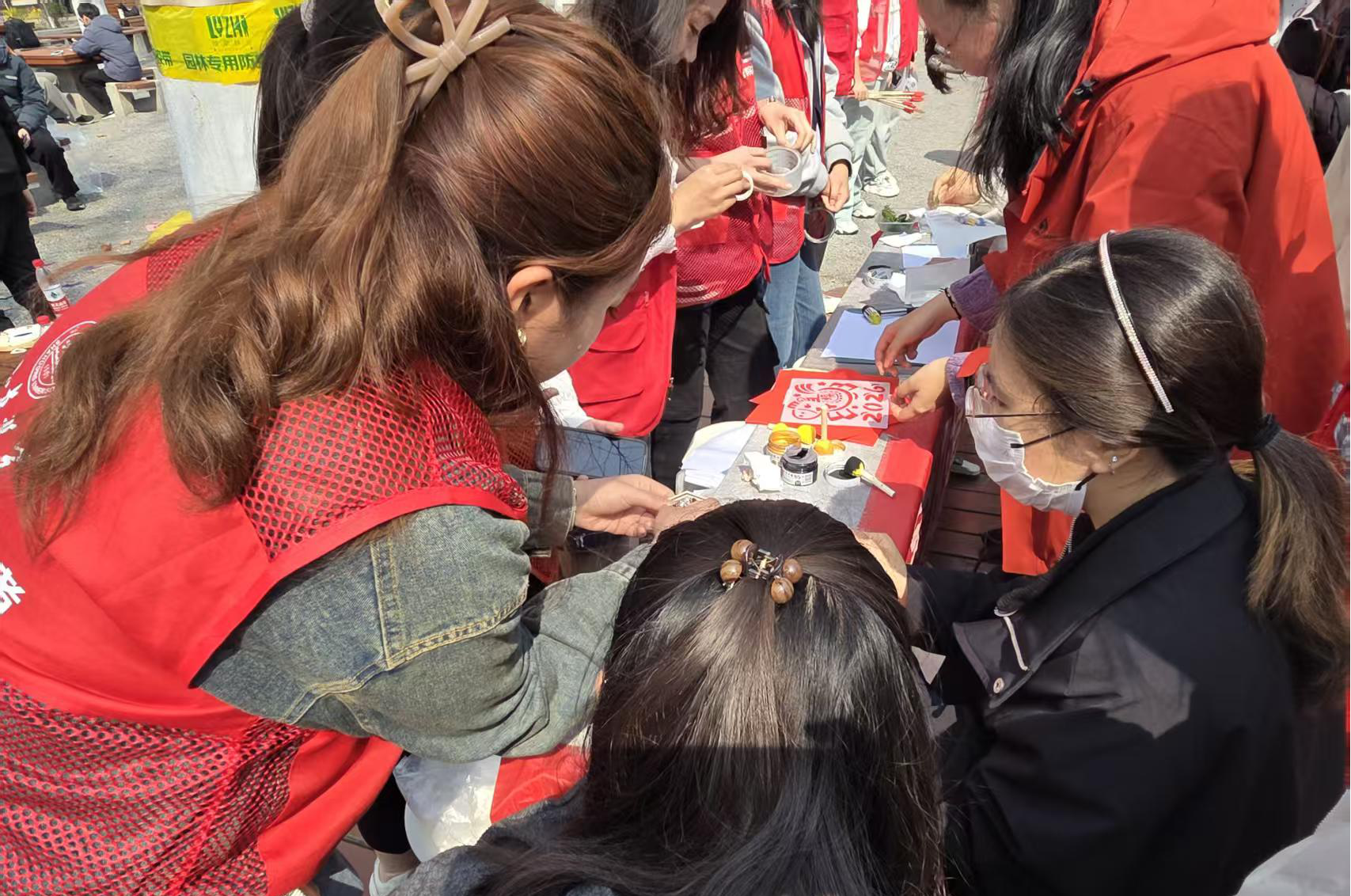 前期筹备时,我和伙伴们从文旅体验设计的角度精心筛选项目。我们既要坚守非遗技艺的文化底蕴,又要简化操作流程、提升参与体验,最终选定了拓染、年画、宋锦、投壶四项活动。这些项目承载着中华优秀传统文化的精髓,形式贴近生活、参与门槛较低,能够自然走进校园,也契合文旅传播中沉浸式体验的理念。看着展台上整齐摆放的各类材料与器具,我满心期待,希望这方小小的展台,能成为非遗融入校园生活的窗口。