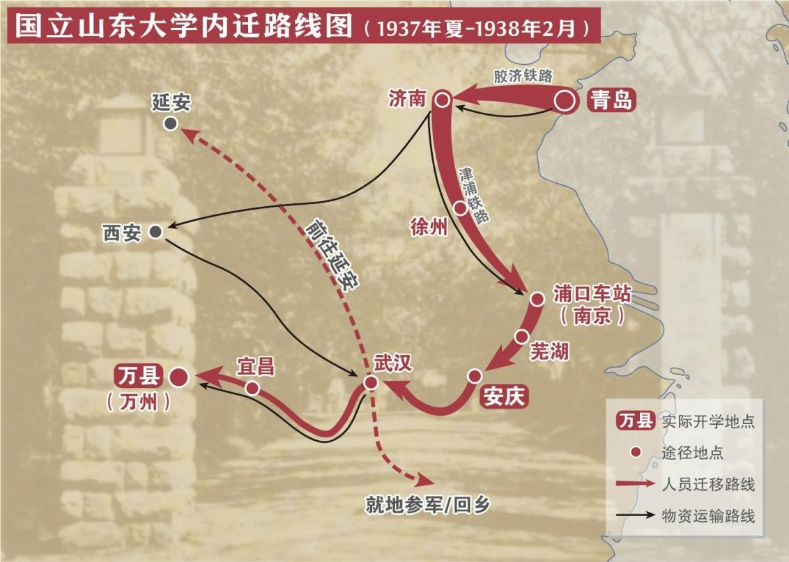 [本站讯]1937年日本发动全面侵华战争,中国人民抗日战争全面爆发。在民族存亡的危急关头,为了保存中国高等教育火种,大批东部高校向西部迁徙,尤以迁移四川省(包括今重庆市)者居多,此时的国立山东大学也踏上了这场内迁之路。1937年11月,国立山东大学自青岛迁安徽安庆开学。1938年初,再迁四川万县开学。1938年2月23日,学校停办。1946年春,国立山东大学在青岛复校。