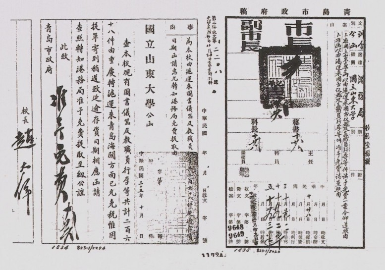 1946年10月,国立山东大学复校物资运抵青岛。图为学校就物资提取事宜致青岛市政府的函件