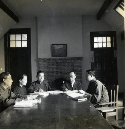 五校校长合影(从左至右):梅贻宝的代表马鑑、吴贻芳、陈裕光、张凌高、汤吉禾