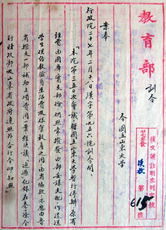 1938年2月23日,国民政府教育部根据行政院2月18日训令,下令将国立山东大学暂行停办。学生大部分转入国立中央大学,个别转入其他大学。在校职工造册送部,另行分配工作,多数被分配到重庆的国立编译馆。图书、仪器、机械分别暂交国立中央图书馆、国立中央大学、国立中央工业职业学校、国立师范学院、国立西北工学院保管使用。