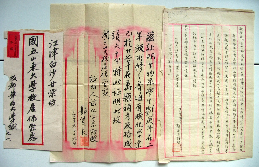 国立山东大学化学系助教郭质良在万县为学生刘庚年出具的成绩证明