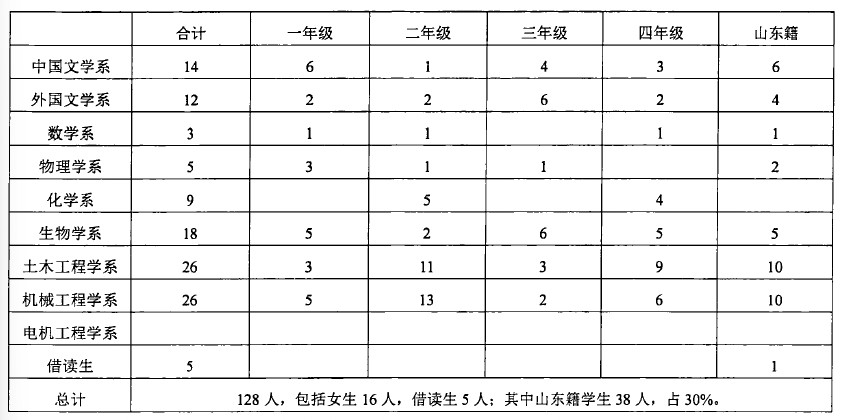 1937年山东大学内迁前有教员80人、职员49人,共129名。计有文、理、工3院9系,在校生517人,另有10多位旁听生。有校舍1411间,价值1809010.40元,可容纳3800人,全校有图书87805册。