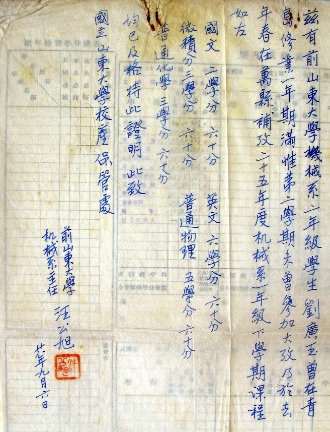 国立山东大学机械系主任汪公旭在四川万县为学生刘广玉出具的成绩证明