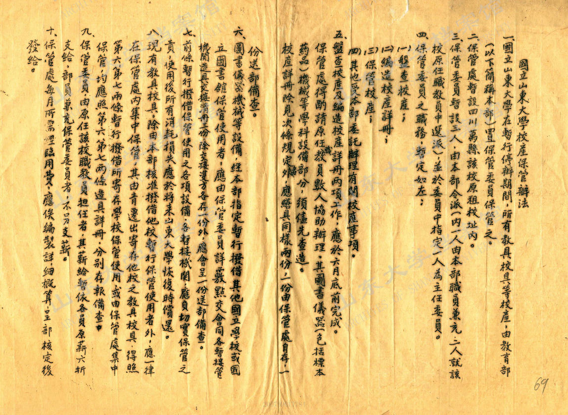 1938年3月15日,国立山东大学校产保管处成立。校产保管处主要职责是盘查校产、编造校产清册、保管校产、核发学生成绩单、办理其他与校产有关事项等。4月14日,国民政府教育部颁发《国立山东大学校产保管办法》。校产保管为国立山东大学复校做好了良好的物资准备。