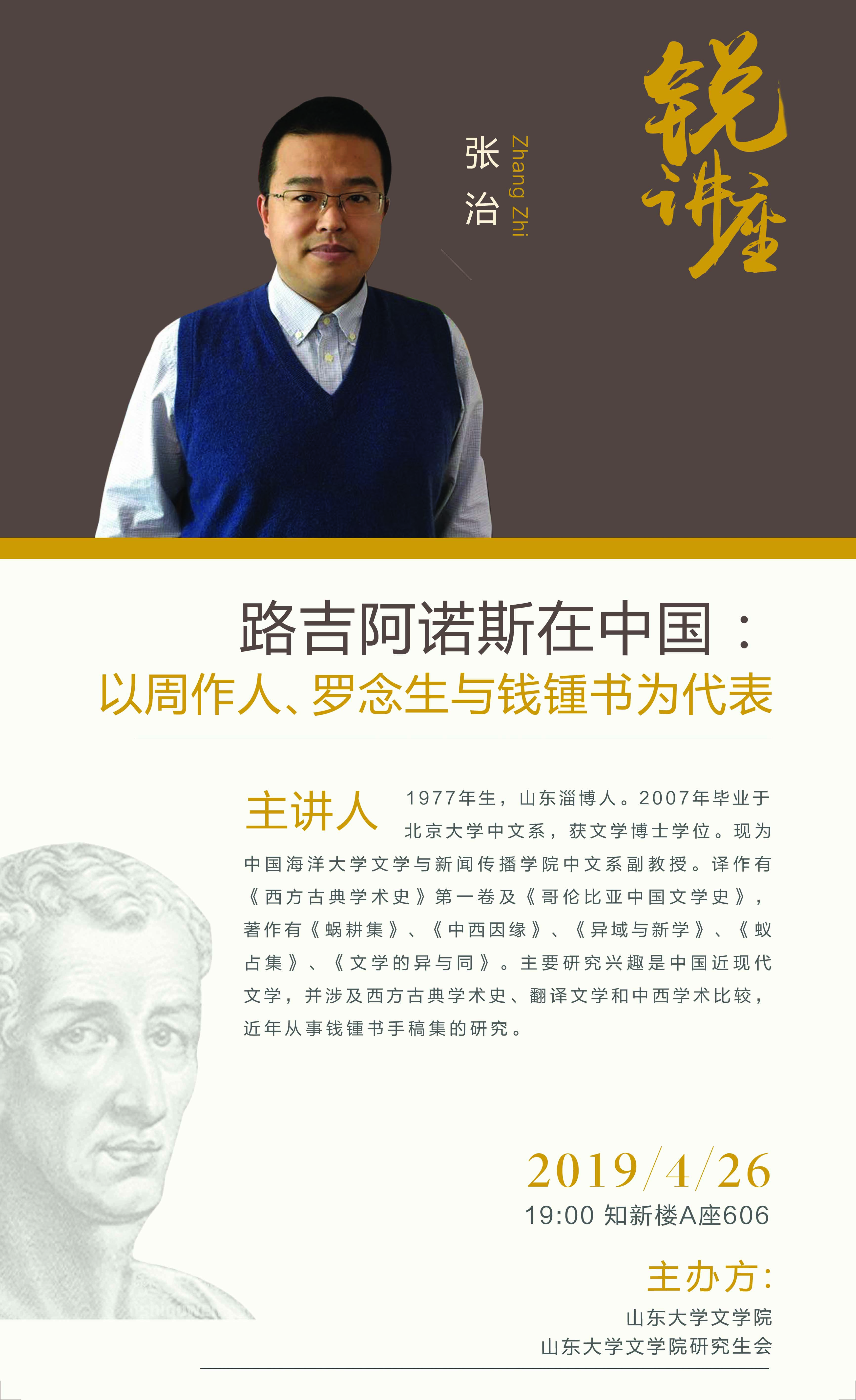 张治,2007年毕业于北京大学中文系,获文学博士学位。现为中国海洋大学文学与新闻传播学院中文系副教授。译作有《西方古典学术史》第一卷及《哥伦比亚中国文学史》,著作有《蜗耕集》《中西因缘》《异域与新学》《蚁占集》《文学的异与同》。主要研究兴趣是中国近现代文学,并涉及西方古典学术史、翻译文学和中西学术比较,近年从事钱锺书手稿集的研究。