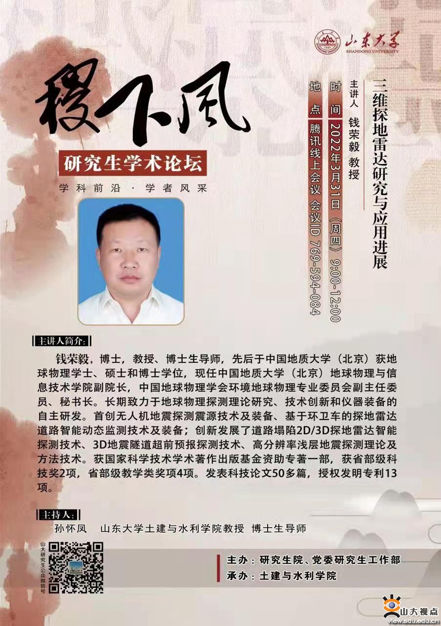 钱荣毅,博士,教授,博士生导师,先后于中国地质大学(北京)获得地球物理学士、硕士和博士学位。现任中国地质大学(北京)地球物理与信息技术学院副院长,中国地球物理学会环境地球物理专业委员会副主任委员、秘书长。长期致力于地球物理探测理论研究、技术创新和仪器装备的自主研发。首创无人机地震探测震源技术及装备、基于环卫车的探地雷达道路智能动态监测技术及装备;创新发展了道路塌陷2D/3D探地雷达智能探测技术、3D地震隧道超前预报探测技术、高分辨率浅层地震探测理论及方法技术。获国家科学技术学术专著出版基金资助专著一部,获省部级科技奖2项,省部级教学类奖项4项.发表科技论文50多篇,授权发明专利13项。