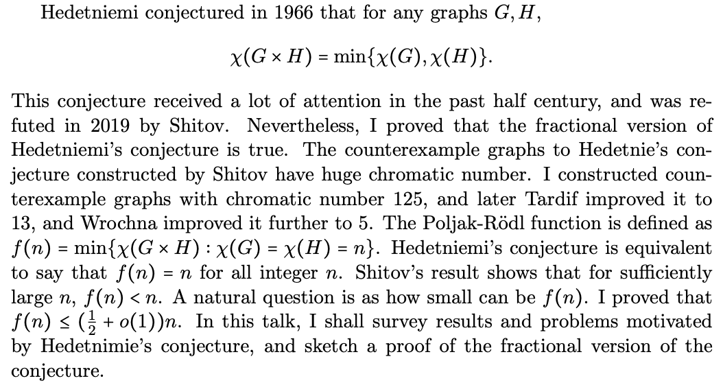 朱绪鼎教授,1991年获得加拿大卡里加里大学数学博士学位,曾任台湾中山大学特聘研究教授,西湾讲座教授。2010年起全职在浙江师范大学工作,任离散数学研究中心主任。朱教授是图染色和图同态领域的国际知名学者,担任J.Graph Theory等十个学术期刊编委,在JCTB等学术期刊发表论文280余篇,其中近百篇以浙师大为署名单位发表。被SCI论文引用2800余次,H-Index为27,三十余次应邀在重要国际学术会议作大会主题报告。在台湾工作期间,获得台湾科学委员会杰出研究奖和台湾数学会学术奖。