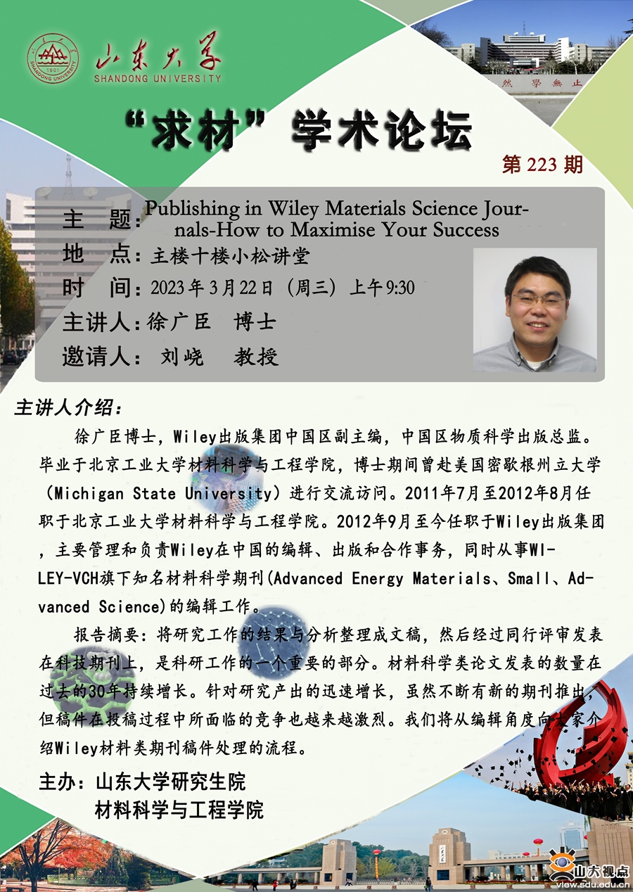 徐广臣博士,Wiley出版集团中国区副主编,中国区物质科学出版总监。毕业于北京工业大学材料科学与工程学院,博士期间曾赴美国密歇根州立大学(Michigan State University)进行交流访问。2011年7月至2012年8月任职于北京工业大学材料科学与工程学院。2012年9月至今任职于Wiley出版集团,主要管理和负责Wiley在中国的编辑、出版和合作事务,同时从事WILEY-VCH旗下知名材料科学期刊(Advanced Energy Materials、Small、Advanced Science)的编辑工作。