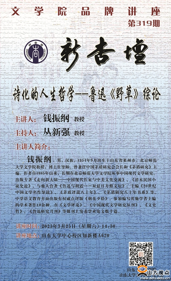 《野草》是鲁迅的散文诗集,也是一部阅读有一定难度的作品集。《野草》体现了作者丰富而深邃的人生哲学,同时也表现了其对现实社会诸方面的看法和态度。《野草》的艺术手法新颖而多样,以一般的象征手法为主,同时也采用了同名关联象征法,梦幻法,直抒胸臆法等其他艺术表现手法,讲座人在长期从事鲁迅作品研究的基础上,对《野草》24篇作品的思想内涵的内在逻辑作了充分的梳理,勾勒出其互相关系,对其艺术手法也作出了简要的阐释。
