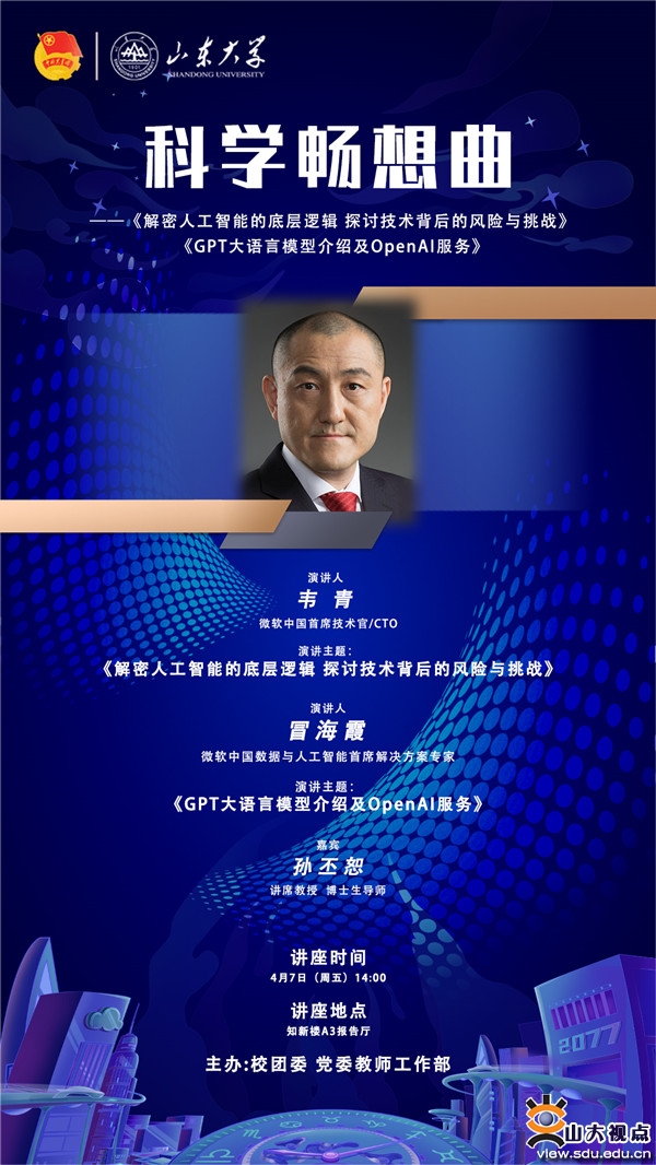 [本站讯]为鼓励学校青年师生把握教育数字化和信息化带来的机遇与挑战,微软中国首席技术官/CTO韦青总裁、微软中国数据与人工智能首席解决方案专家冒海霞总监等专家学者,将与大家共同探讨ChatGPT的发展与应用。