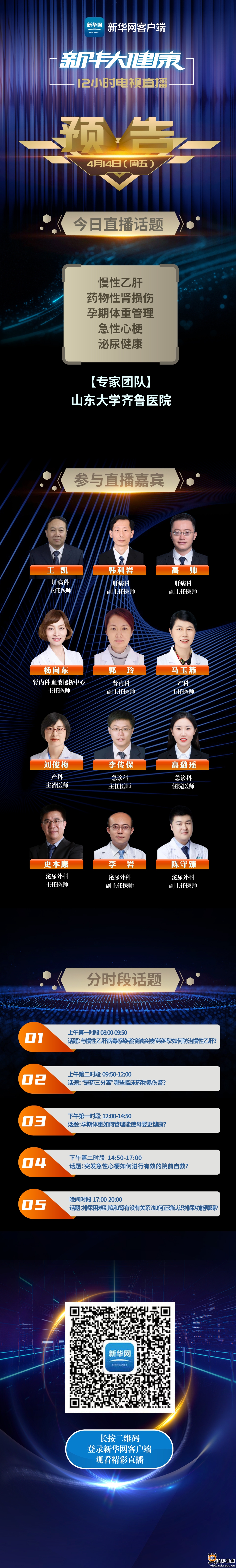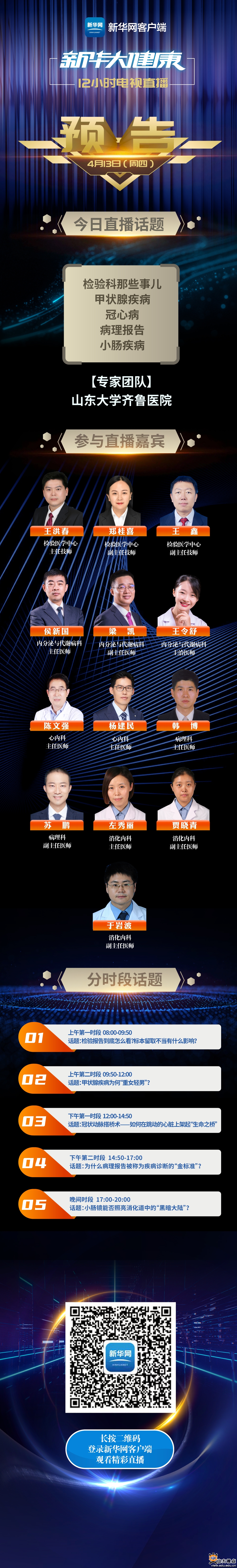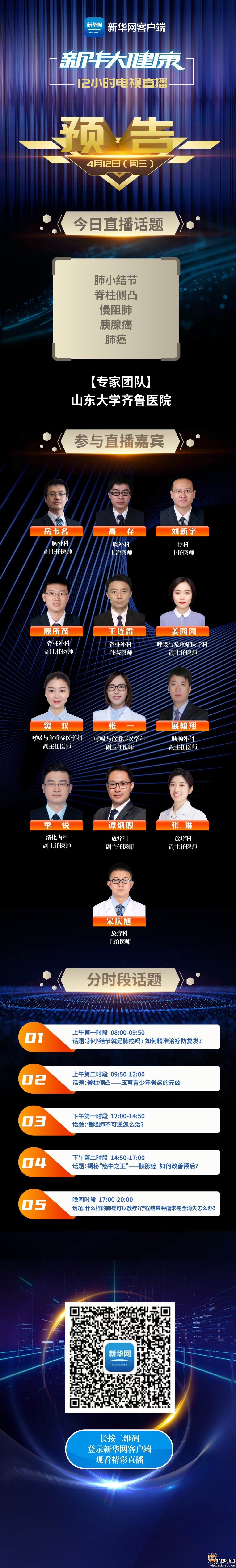 [本站讯]4月12—14日,山东大学齐鲁医院38位专家将走进新华网推出的《新华大健康》直播栏目,进行为期3天的科普直播,为广大观众传播权威医学知识,展现齐鲁医院风采。38位专家分别是来自胸外科、骨科、呼吸与危重症医学科、普通外科、肿瘤放疗科、检验医学中心、内分泌与代谢病科、心血管内科、病理科、消化科、肝病科、肾内科、妇产科、急诊科、泌尿外科等15个优势科室的权威专家。他们将结合相关专业领域特长,就公众普遍关注的寻医问药热点与治病救人的痛点进行全面、细致地讲解,向公众传播应知、未知、必知的临床医疗刚需知识。节目现场,专家们还将与观众、网友进行问答互动,有针对性地满足公众不同需求,在线答疑解惑。此次直播活动,将切实发挥齐鲁医院“国家队”作用,努力为人民提供全生命周期的健康服务,助力“健康中国”建设。