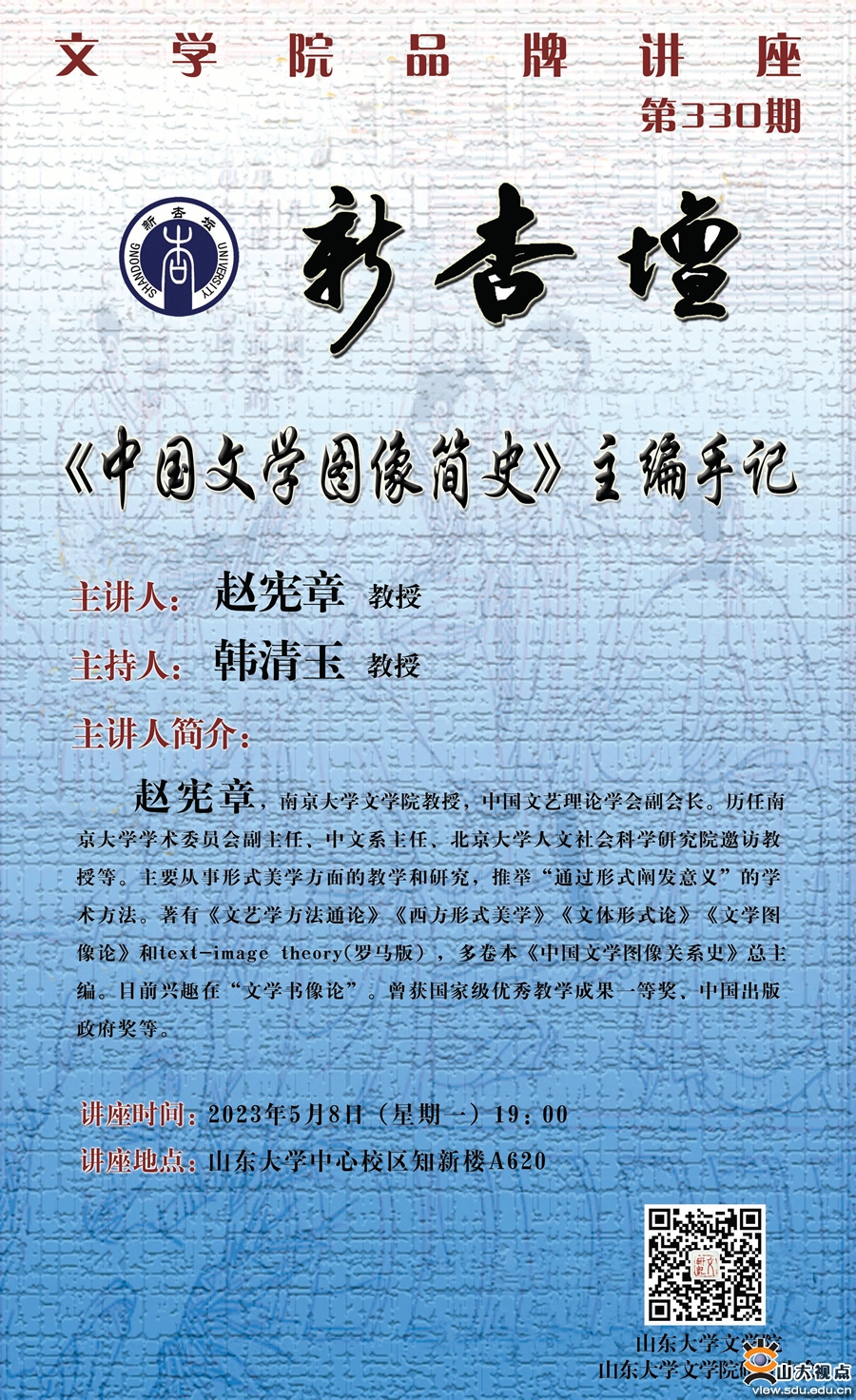 《中国文学图像简史》以多卷本《中国文学图像关系史》为母本,按照大学教材的要求、规范和体例进行编写,意在为大学生、研究生或一般文艺爱好者提供一种别开生面的新教材、新读物。本书以“文学的图像”为对象,以“文图关系”为线索,以“语图关系”为方法,依照历史顺序,点面结合、深入浅出,详略兼顾、突出经典,简明扼要、行文流畅。本书主编赵宪章教授将在这次讲座中与大家共享编撰体会,交流文学与图像研究的经验与方法。