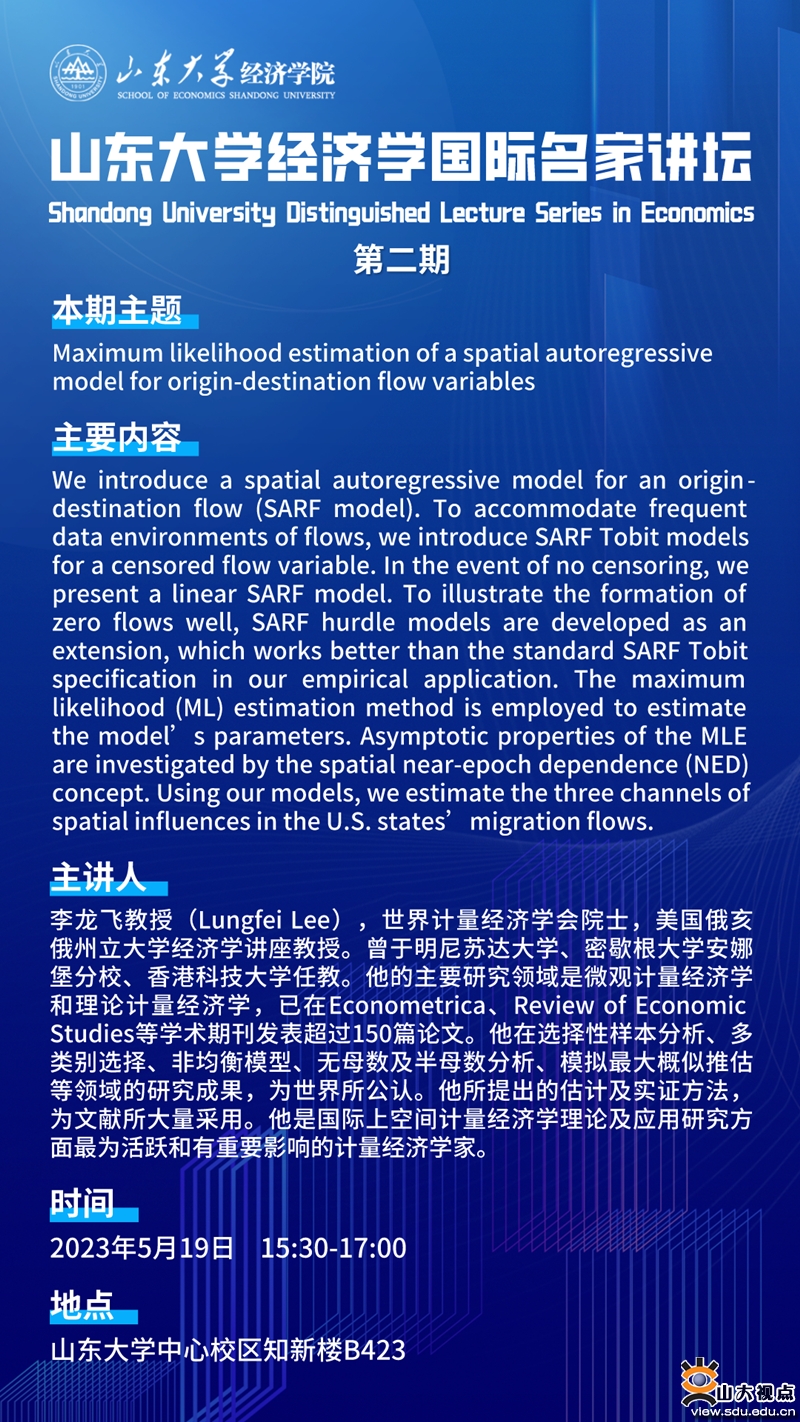 山东大学经济学国际名家讲坛第二期:Maximum likehood estimation of a spatial autoregressive model for origin-destination flow variables