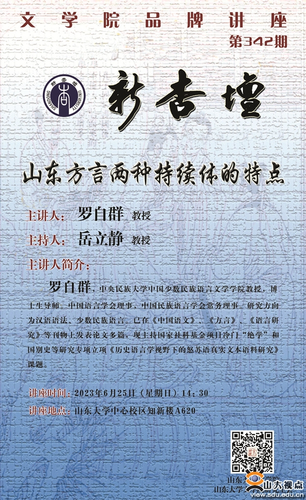 普通话中表示动作或状态持续的方式有多种,比如:“他在上课”“课还上着呢”“他正上着课呢”等,现代汉语方言中也有和它相对应的表达,其中,“动词+持续标记”“动词+宾语+‘在’引导的介词结构”这两种持续体在山东方言中不仅存在而且独具特色。本讲座将把山东方言这两种形式的持续体放在现代汉语方言的背景下讨论,分析其特点。山东方言有“著(着)”类持续标记的不同语音形式,同时还保留有“动词+宾语+‘著’引导的介词结构” ,有一定的存古性。
