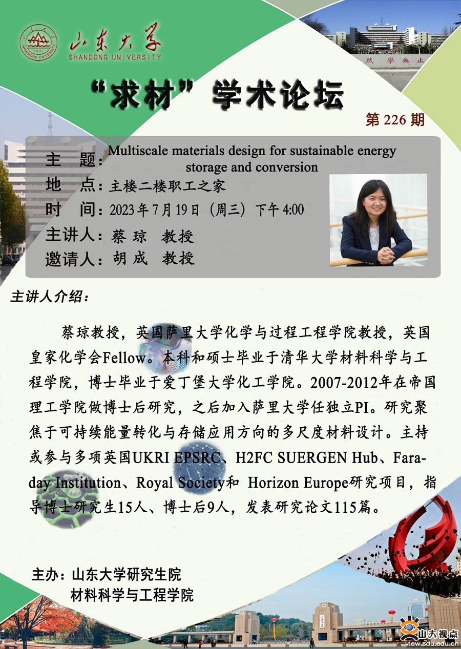 蔡琼教授,英国萨里大学化学与过程工程学院教授,英国皇家化学会Fellow。本科和硕士毕业于清华大学材料科学与工程学院,博士毕业于爱丁堡大学化工学院。2007-2012年在帝国理工学院做博士后研究,之后加入萨里大学任独立PI。研究聚焦于可持续能量转化与存储应用方向的多尺度材料设计。主持或参与多项英国UKRI EPSRC、H2FC SUERGEN Hub、Faraday Institution、Royal Society和 Horizon Europe研究项目,指导博士研究生15人、博士后9人,发表研究论文115篇。
