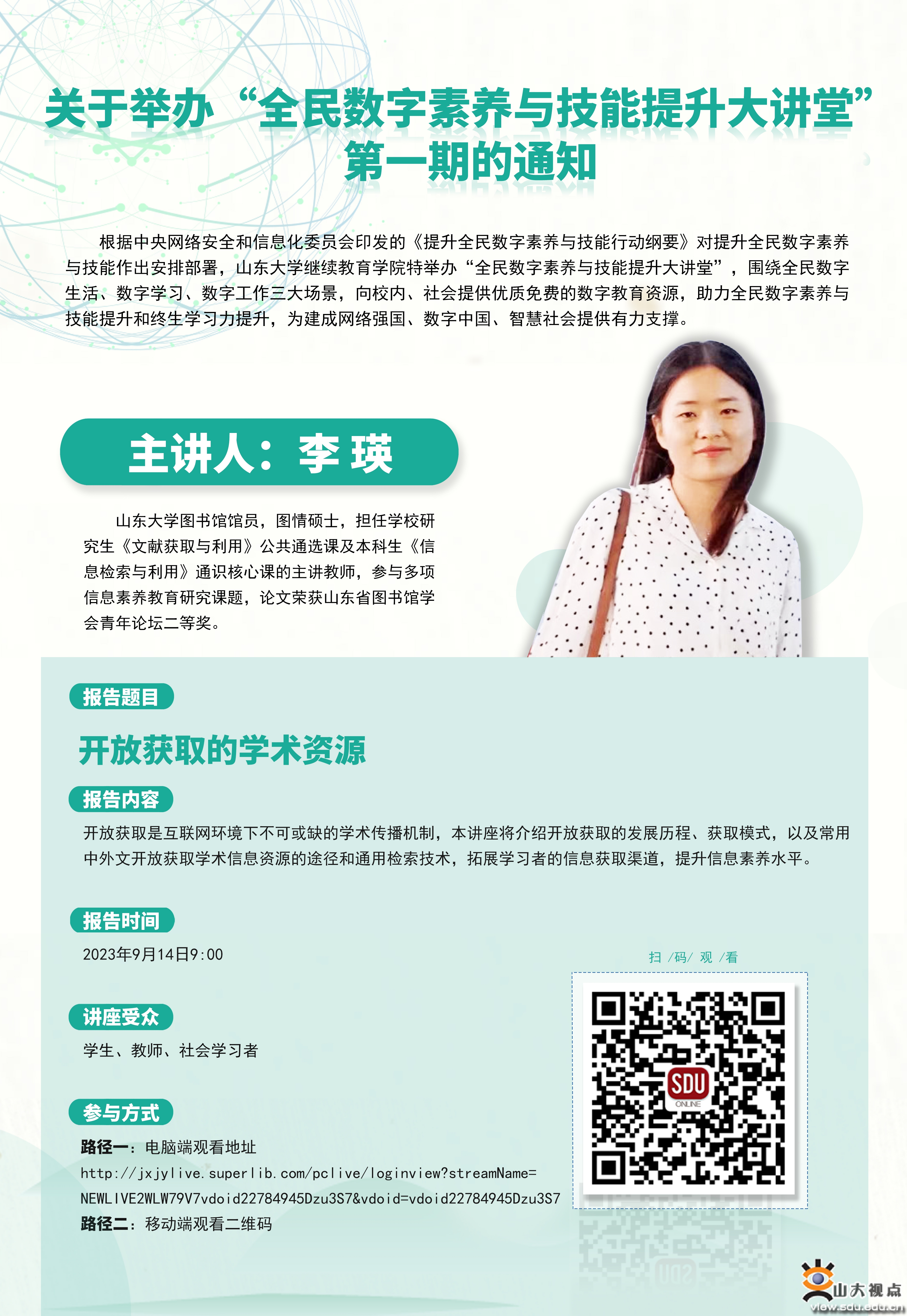 开放获取是互联网环境下不可或缺的学术传播机制,本讲座将介绍开放获取的发展历程、获取模式,以及常用中外文开放获取学术信息资源的途径和通用检索技术,拓展学习者的信息获取渠道,提升信息素养水平。
