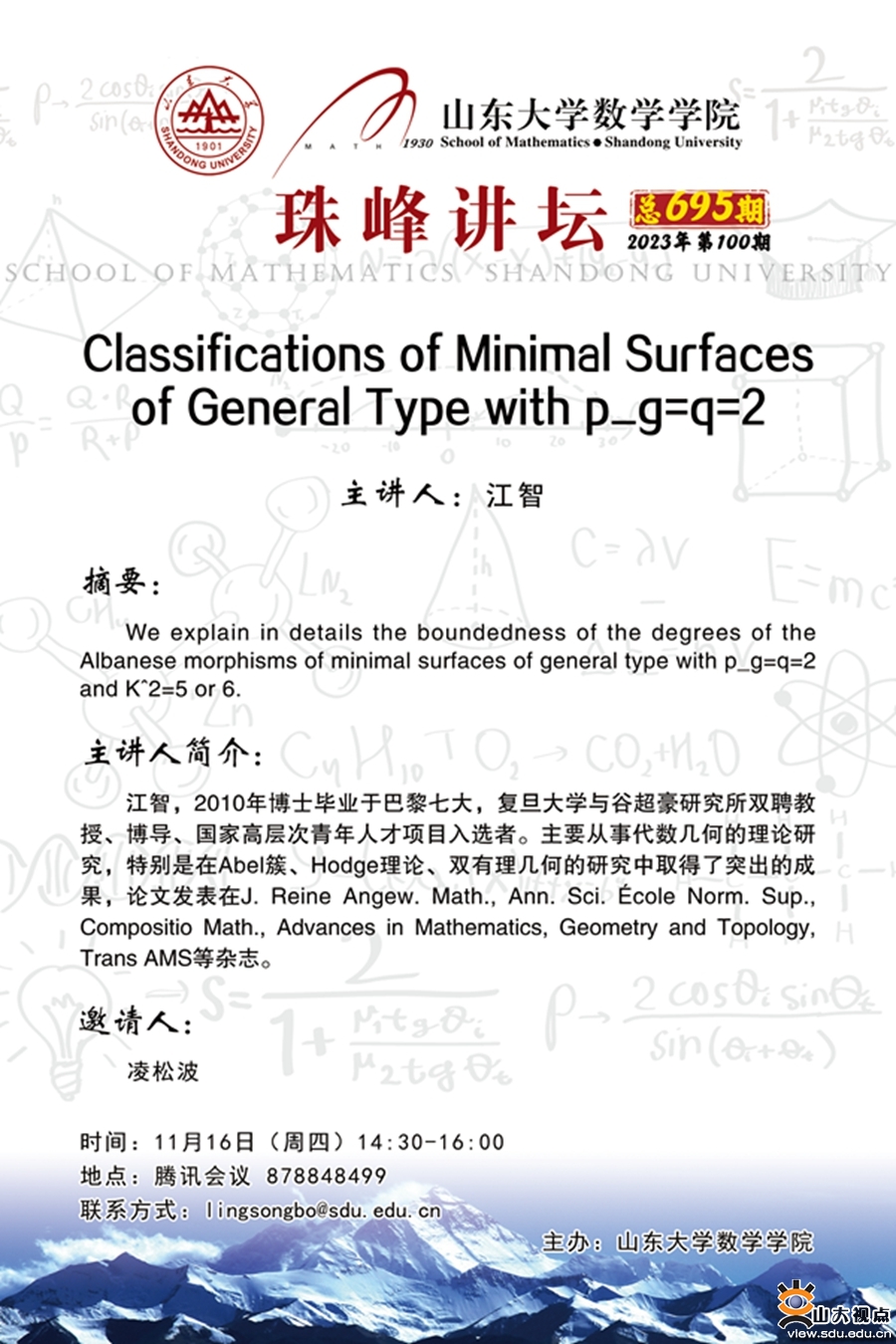 数学学院珠峰讲坛第695期:Classifications of Minimal Surfaces of General Type with p_g=q=2