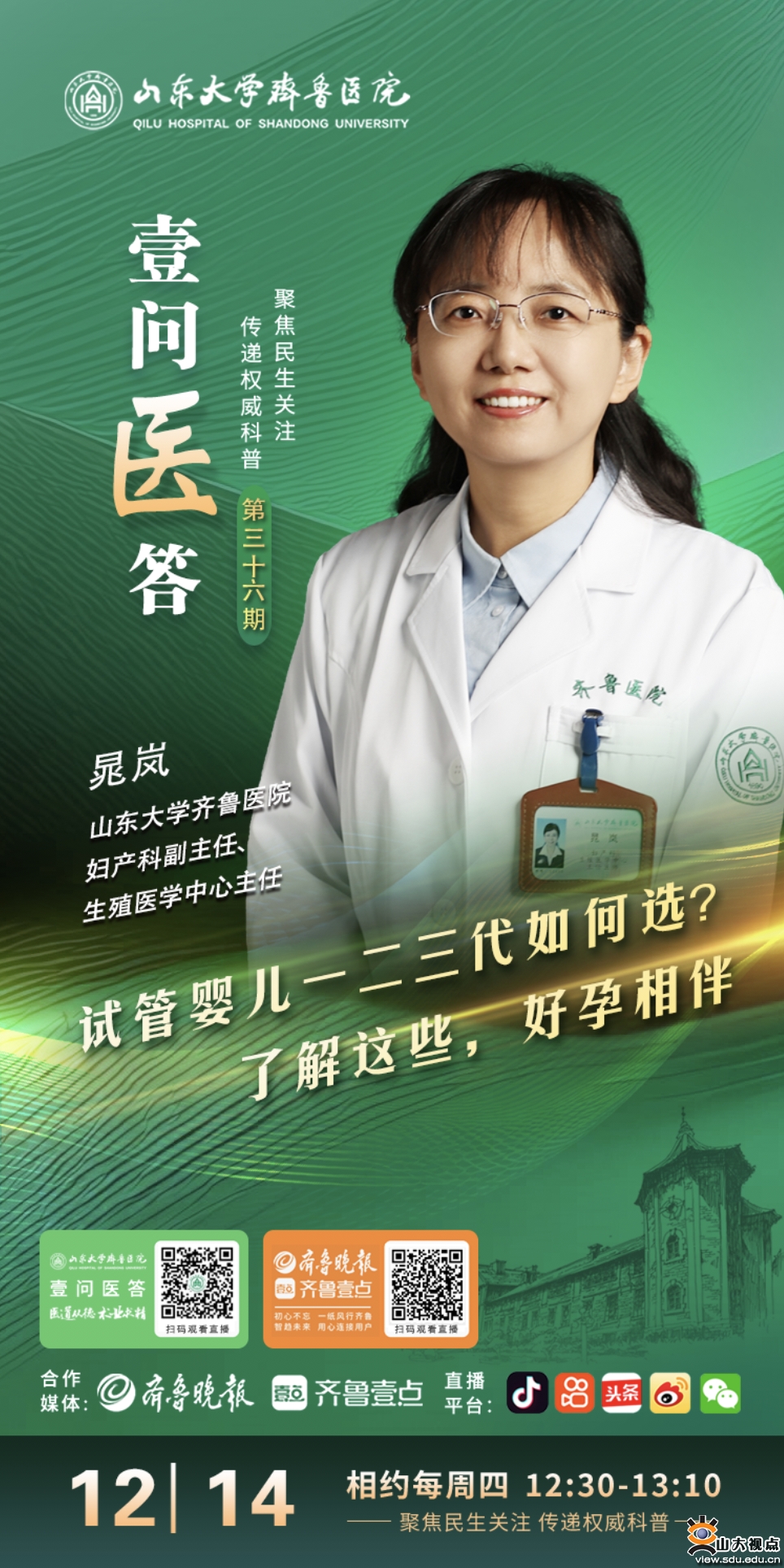 山东大学齐鲁医院妇产科副主任、生殖医学中心主任晁岚将在“壹问医答”直播间,为大家详细解读试管婴儿方面的相关医学知识。
