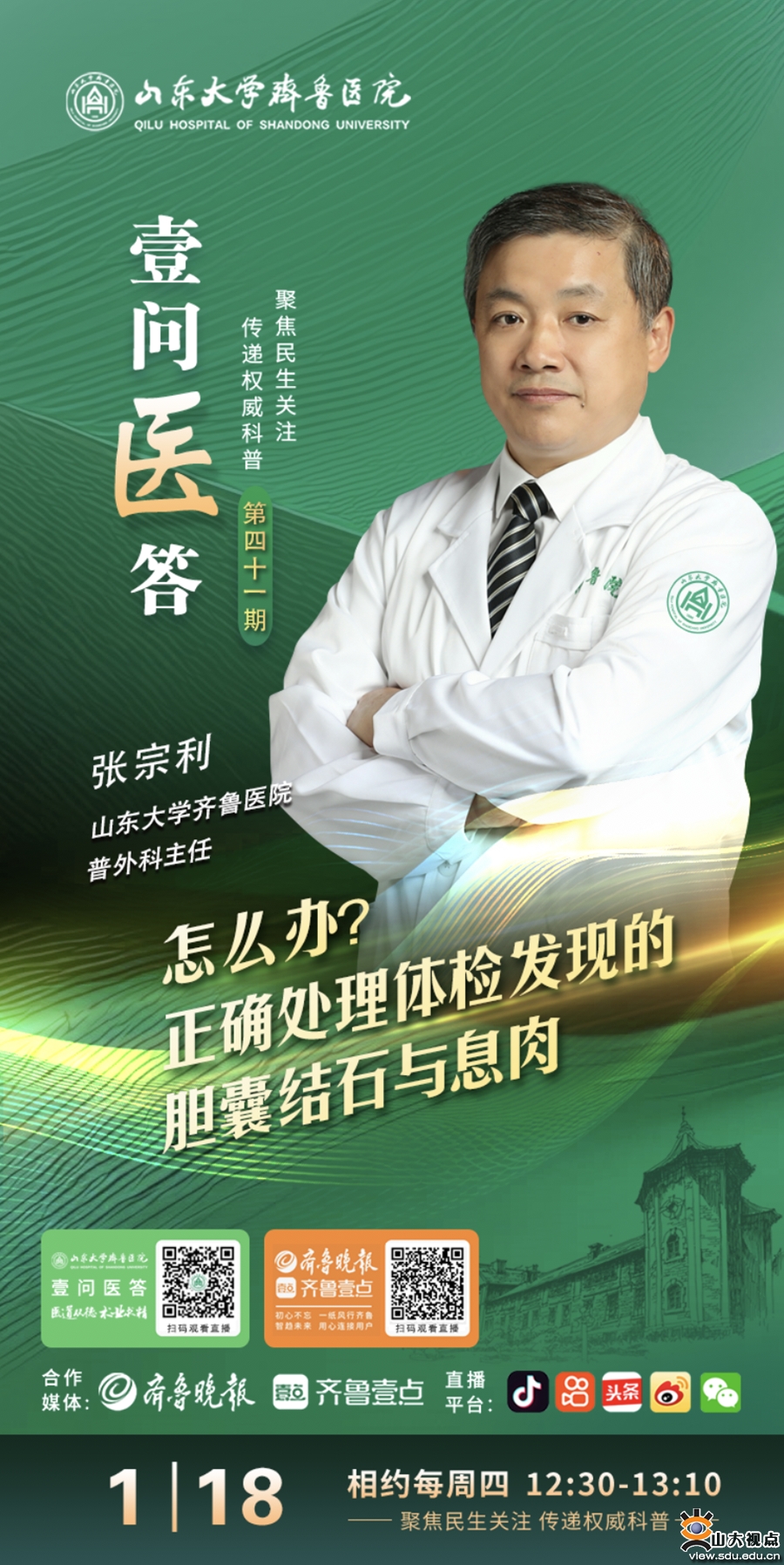 [本站讯]1月18日12:30,山东大学齐鲁医院普外科主任张宗利将在“壹问医答”直播间,详细解读胆囊结石和胆囊息肉的相关医学知识。关注山东大学齐鲁医院微信视频号和齐鲁壹点客户端,让我们了解更多医学知识。